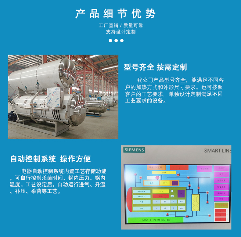 多種罐體結構,多種加熱方式,可根據需求定制。殺菌鍋按控制方式分為手動,半自動,全自動;按鍋體材質分為不銹鋼和碳鋼兩種。溫度,時間,壓力自動控制,操作簡單方便,耗能低。在殺菌過程中使用的工作介質可循環使用,節省了能源、時間及人力、物力的消耗,降低了生產成本。高溫短時間滅菌采用雙罐熱水循環進行殺菌,事先將熱水罐內的水加熱到滅菌所要求的溫度,從而縮短了滅菌時間,提高了工作效率。