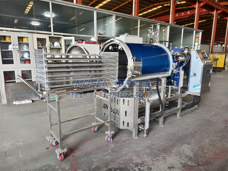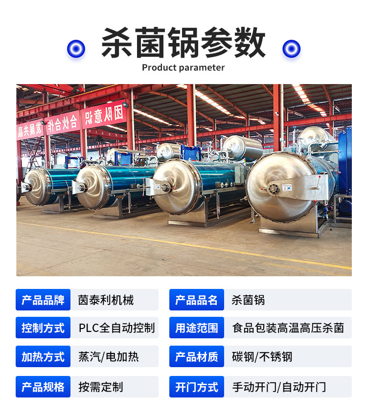 殺菌鍋設備主要用于肉制品、水果罐頭、奶制品、豆制品、農副產品、飲料制品、蛋制品、水產品、八寶粥、調味品、食用菌、寵物食品、湯和熟食以及果蔬等食品的殺菌。殺菌鍋由鍋體、鍋蓋、開啟裝置、鎖緊鍥塊、安全聯鎖裝置、軌道、殺菌盤、蒸汽噴管及若干管口、保溫層、熱水罐等組成。