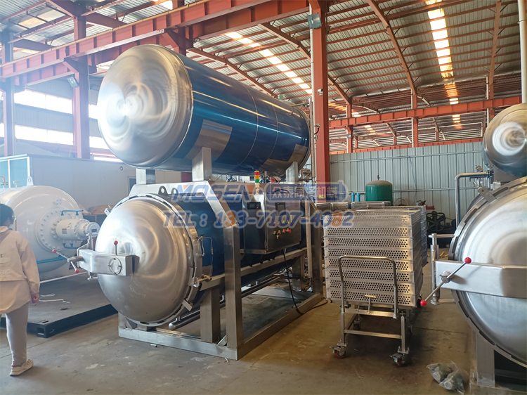 殺菌鍋設備主要用于肉制品、水果罐頭、奶制品、豆制品、農副產品、飲料制品、蛋制品、水產品、八寶粥、調味品、食用菌、寵物食品、湯和熟食以及果蔬等食品的殺菌。殺菌鍋由鍋體、鍋蓋、開啟裝置、鎖緊鍥塊、安全聯鎖裝置、軌道、殺菌盤、蒸汽噴管及若干管口、保溫層、熱水罐等組成。